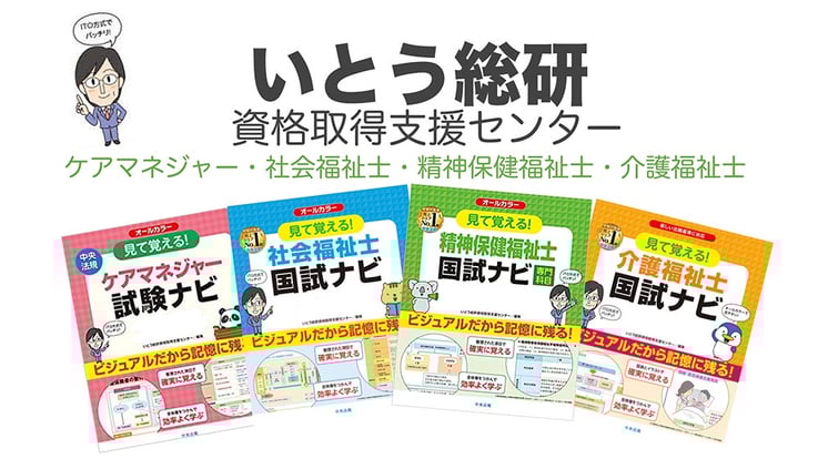 いとう総研では、ケアマネジャー、社会福祉士、精神保健福祉士、介護福祉士の資格取得を目指す方に向けて、資格取得試験のサポートや参考書の出版を行っております。